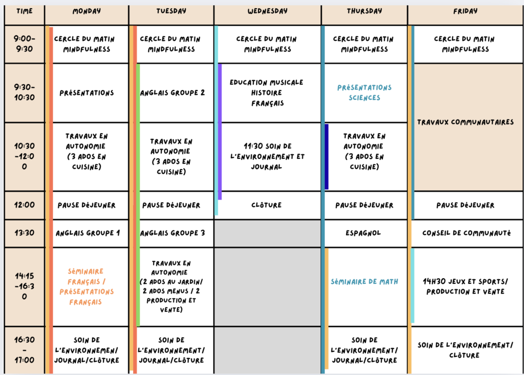Voici un exemple de notre emploi du temps, qui peut varier en fonction des périodes et des différents intervenants. Les séances de travaux en autonomie permettent aux élèves de progresser dans leur projet personnel de recherche ou de s’avancer dans leurs devoirs. Ces moments sont encadrés par des adultes présents pour les accompagner et les soutenir. Des présentations sur de nouvelles méthodes ou notions peuvent également être proposées. Les adolescents disposent ensuite de temps pour mettre en pratique ces notions, que ce soit en autonomie ou avec l’aide d’un adulte. Cet emploi du temps reste fluide afin de répondre aux besoins de adolescents et des aléas de la vie.