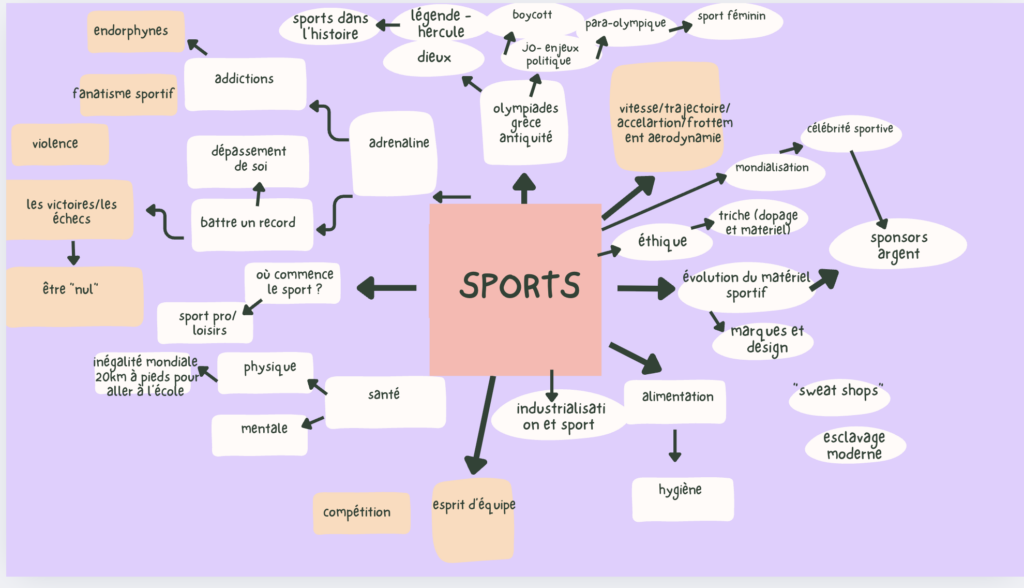 Un exemple de carte mentale réalisée en début de période par les adolescents, visant à orienter leurs études et travaux académiques. Cette démarche favorise une explosion d’idées, encourage une approche interdisciplinaire et sert de tremplin pour l’exploration de nouvelles pistes. Elle permet également de structurer les réflexions tout en ouvrant la possibilité de faire appel à des experts pour approfondir certains sujets. Cette étape fondamentale marque le lancement du plan d’étude et des travaux pour la période